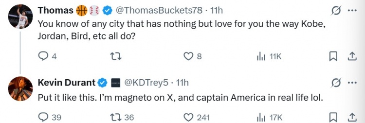 杜蘭特:可以這么說(shuō),我是推特(X)巨頭,我在現實(shí)生活中是美國隊長(cháng),哈哈。