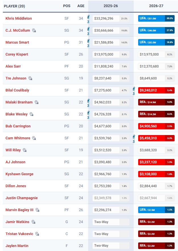 圖中2026-27(賽季)下方,藍色的為完全自由球員、棕色的為受限制自由球員、紅色的為球隊選項