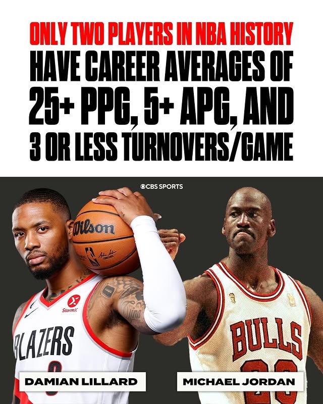 生涯至今,利拉德場(chǎng)均25.1分4.3籃板6.7助攻1.0搶斷,失誤2.8次;喬丹場(chǎng)均30.1分6.2籃板5.3助攻2.3搶斷,失誤2.7次。