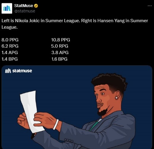 隨后數據媒體StateMuse曬出楊瀚森和約基奇的夏聯(lián)數據對比,約基奇場(chǎng)均8分6.2籃板1.4助攻1.4蓋帽,楊瀚森場(chǎng)均10.8分5籃板3.8助攻1.6(實(shí)為2.3)蓋帽,除了籃板小楊均占上風(fēng)。