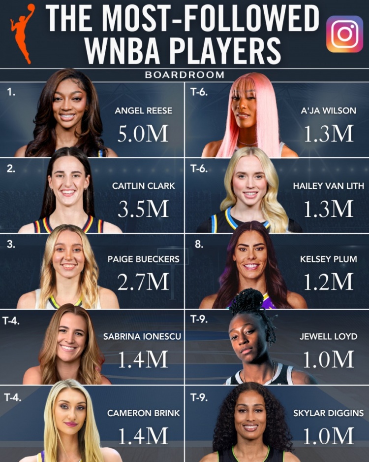 7月21日訊 美媒boardroom統計了WNBA球星的社媒粉絲數排行,并配文寫(xiě)到:一些女子籃球界的大牌球星正在Instagram上迅速積累超高人氣。