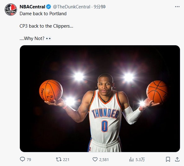美媒NBACentral曬出威斯布魯克身穿雷霆球衣的照片:“利拉德回歸開(kāi)拓者,保羅回歸快船,那么為什么不?”