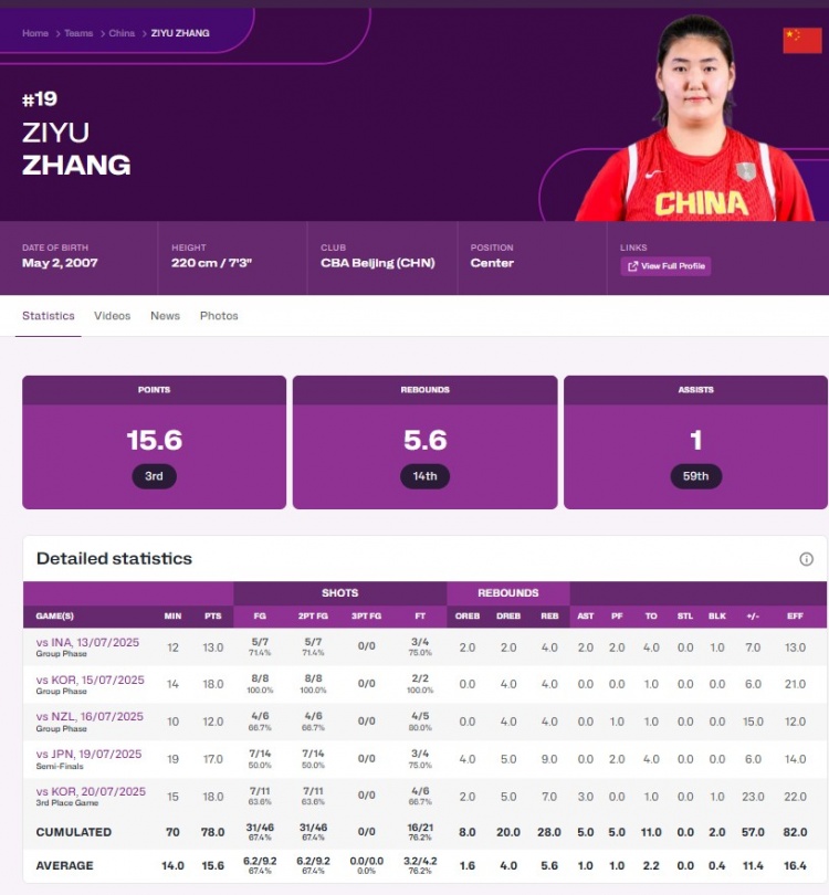 張子宇已經(jīng)是本屆亞洲杯總得分第三、場(chǎng)均得分第二、命中率第一的選手