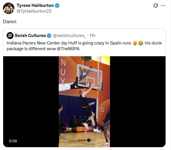 美媒Swish Cultures曬出赫夫在西班牙的一個(gè)球局中大殺四方的視頻,哈利伯頓言簡(jiǎn)意賅地點(diǎn)評新隊友:“我嘞個(gè)豆?!?/p>