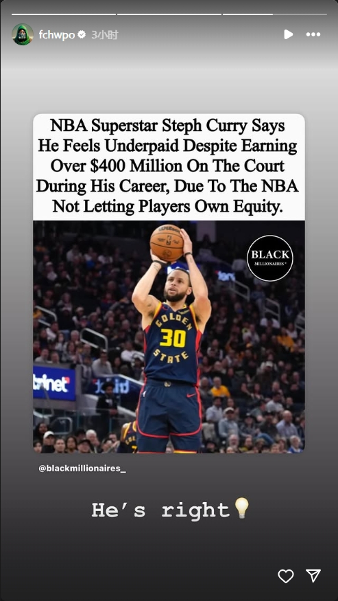庫里表示,盡管他在職業(yè)生涯中球場(chǎng)收入已超過(guò)4億美元,但由于NBA不允許球員持有股權,讓他覺(jué)得自己薪酬偏低。