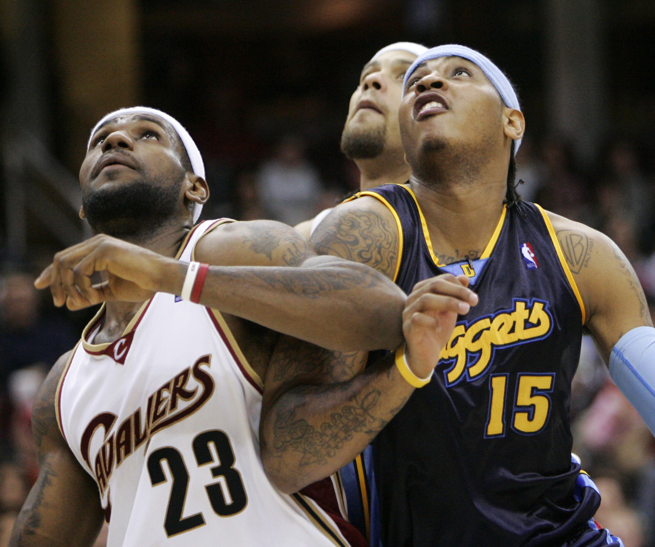 2003-04賽季,安東尼場(chǎng)均21分6.1籃板2.8助攻,掘金隊最終43勝39負排名西部第8進(jìn)入季后賽,詹姆斯場(chǎng)均20.9分5.5籃板5.9助攻,騎士隊最終35勝47負未能進(jìn)入季后賽。2003年最佳新秀評選,詹姆斯得分508分排名第一,安東尼得分403分排名第二。