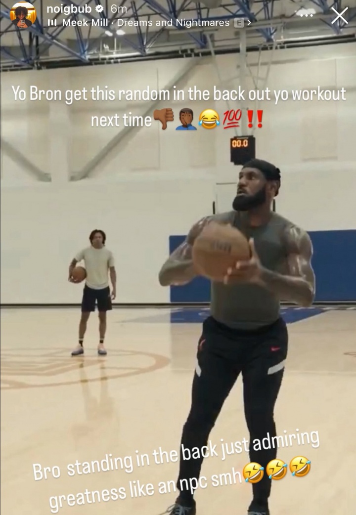 視頻的背景中,奇才后衛卡爾頓-鮑勃-卡林頓站著(zhù)認真欣賞,他隨后在Instagram上調侃自己說(shuō):“Yo老詹!下次帶上背景里這人一起練唄?????♂?????!哥們兒站在那里像個(gè)NPC一樣哎喲我去??????”