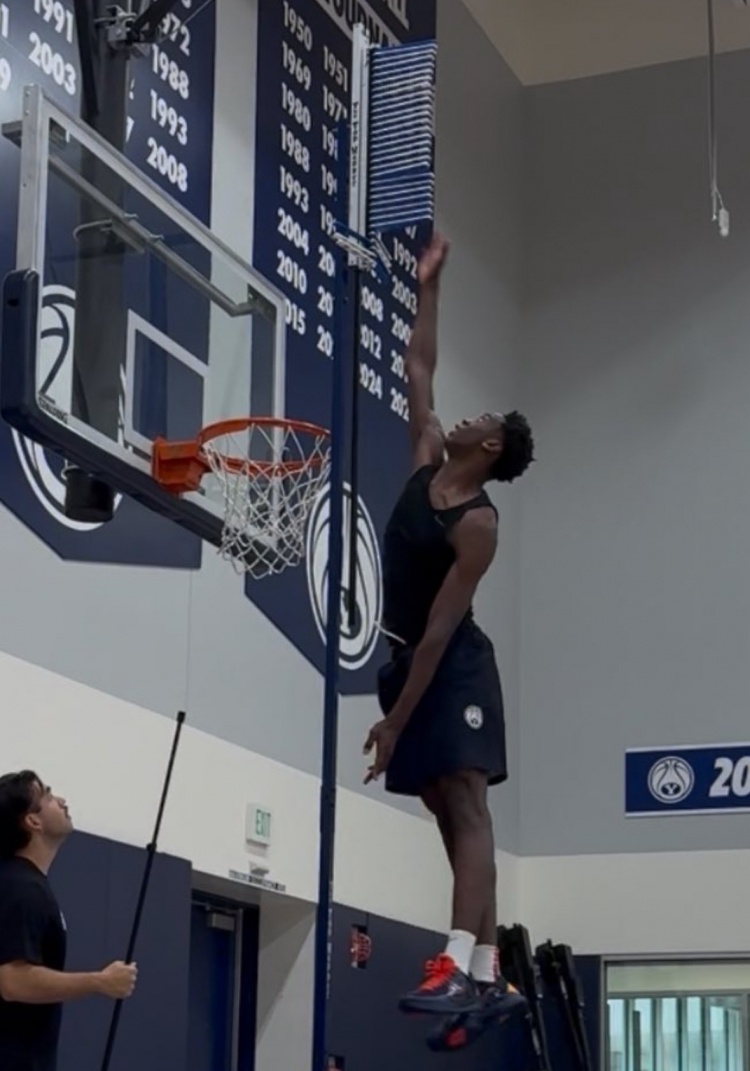 7月30日訊 記者Evan Sidery報道,在最近一次楊百翰大學(xué)的訓練中,AJ-迪班薩展示了他超強的彈跳。從圖片中可以看到,迪班薩的垂直彈跳直接讓他的頭完全高出籃筐。