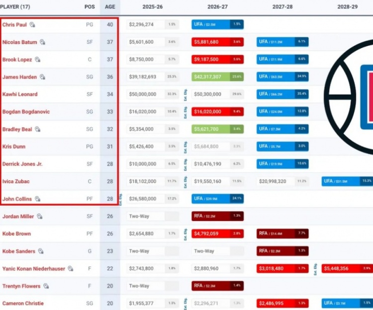 跟雷霆、步行者、凱爾特人這種核心陣容比較年輕的隊伍相比,快船以高齡球員為班底,所有的力量積蓄都是為了接下來(lái)兩個(gè)賽季,因為萊昂納德的合同只剩這兩個(gè)賽季。哈登和比爾雖然也剩兩個(gè)賽季,但2026-27賽季可以選擇不執行。