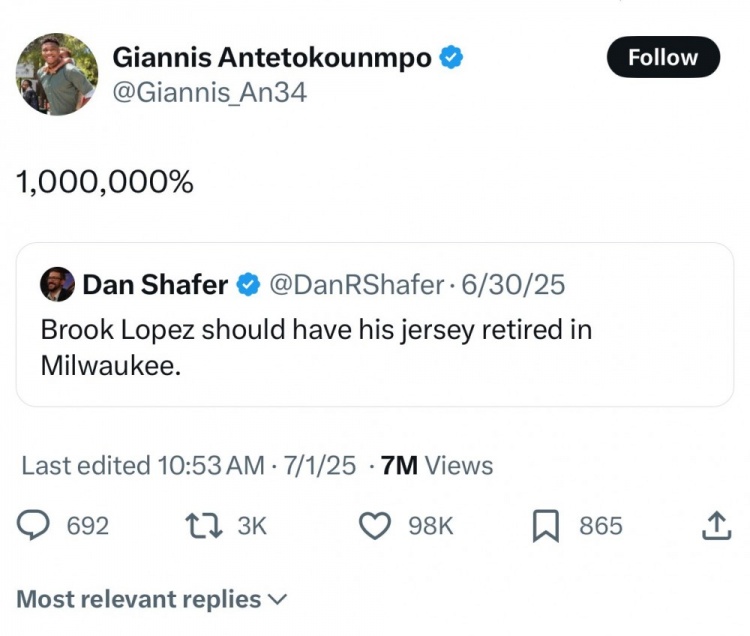 值得一提的是,在7月初,字母哥在回答球迷問(wèn)答的時(shí)候曾表示,雄鹿會(huì )1000000%退役大洛的球衣。