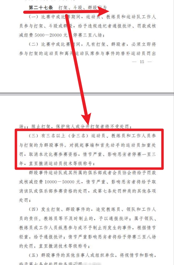 根據《中國籃球協(xié)會(huì )紀律準則和處罰規定》第二十七條第(三)項規定:有三名以上(含三名)運動(dòng)員、教練員和工作人員參與打架的為群毆事件。對挑起事端和首先動(dòng)手的運動(dòng)員加重處罰,取消本次比賽參賽資格,情節嚴重、影響惡劣者停賽一至三年,直至撤消運動(dòng)員技術(shù)等級稱(chēng)號。