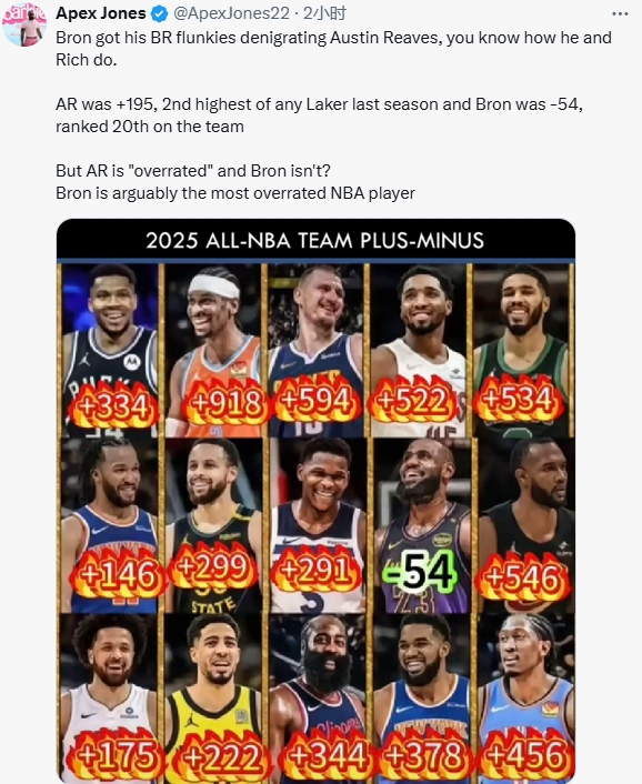 對此,有球迷列出了上賽季的各球星正負值為里夫斯鳴不平:“詹姆斯讓他的忠實(shí)擁躉貶低去奧斯汀-里夫斯,這招大家都懂。里夫斯上賽季正負值為+195,是湖人隊中第二高的,而詹姆斯的正負值為-54,在球隊中排名第20位。但里夫斯卻被認為是“被高估”了?實(shí)際上,詹姆斯可能是NBA中最被高估的球員之一?!?/p>