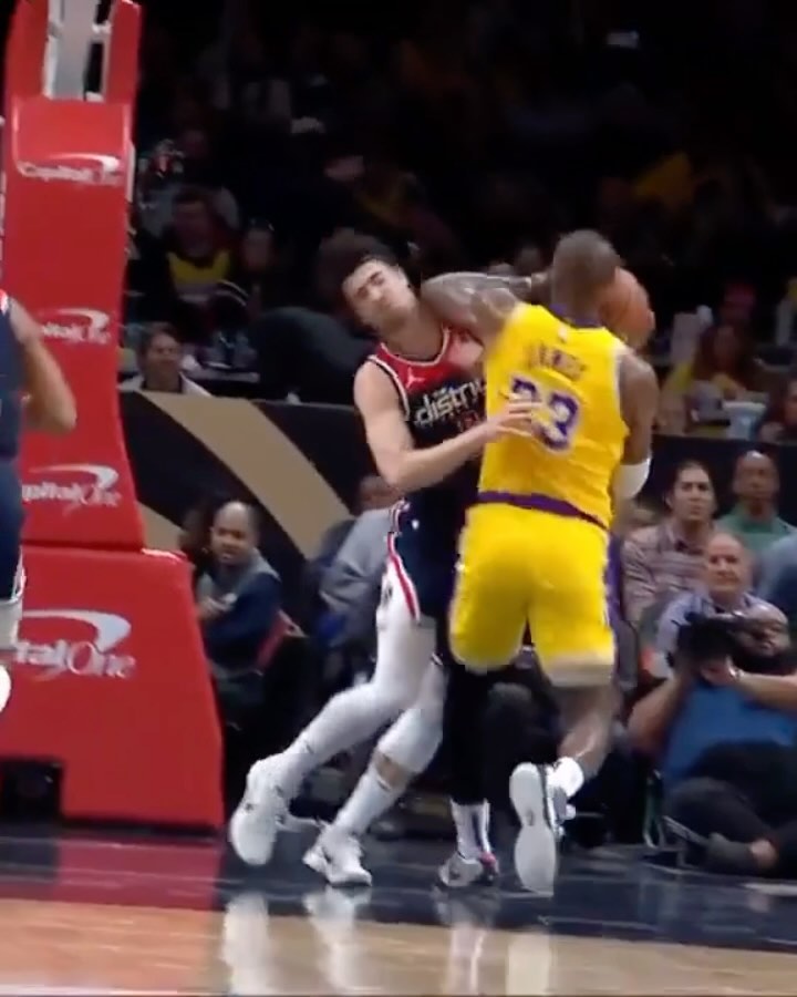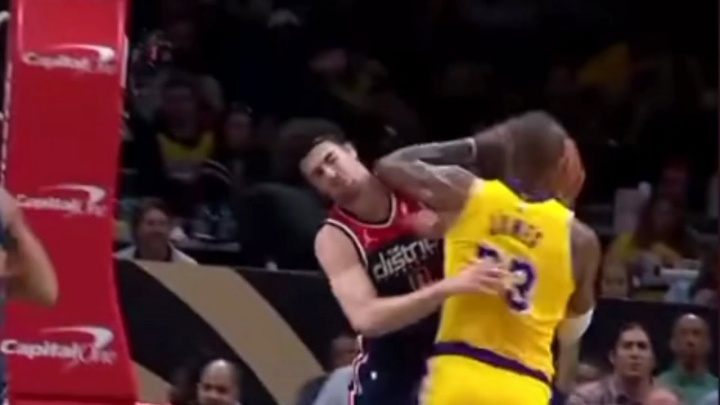 2024年4月,湖人客場(chǎng)挑戰奇才,詹姆斯轉身肘到阿夫迪亞腦袋,從進(jìn)攻犯規升級一級惡意犯規。