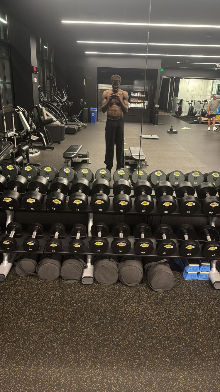 艾頓曬出一張他在湖人訓練館的訓練自拍,對著(zhù)鏡子展示上身肌肉線(xiàn)條。