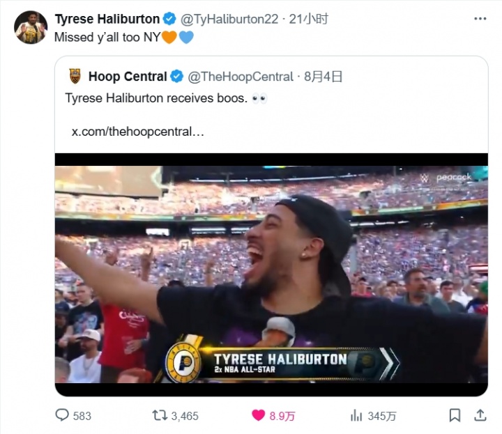 事后,哈利伯頓還在推特上轉發(fā)了這個(gè)片段,并對紐約球迷表示:“紐約!我也想死你們啦!NY????”