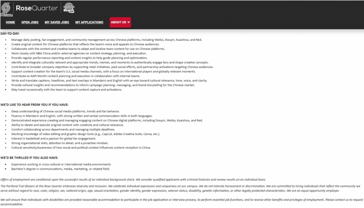我們理想的候選人是一位富有創(chuàng )意、精通文化的敘事者,對中國社媒平臺、趨勢和粉絲行為有著(zhù)深刻的理解,精通普通話(huà)和英語(yǔ),擅長(cháng)為中美兩國的平臺量身定制引人入勝的內容,并熱衷于將全球觀(guān)眾與籃球聯(lián)系起來(lái)。我們正在尋找一位能夠為我們不斷壯大的內容團隊帶來(lái)創(chuàng )造力、適應能力的強大協(xié)作能力的人才。