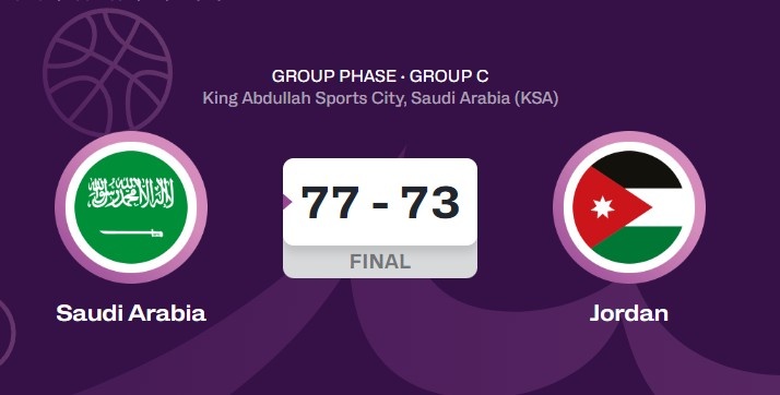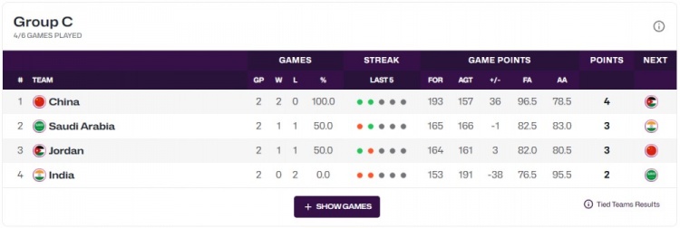 C組的形勢,中國男籃目前2勝0負小組第一,沙特1勝1負第2,約旦1勝1負第3,印度0勝2負第4。