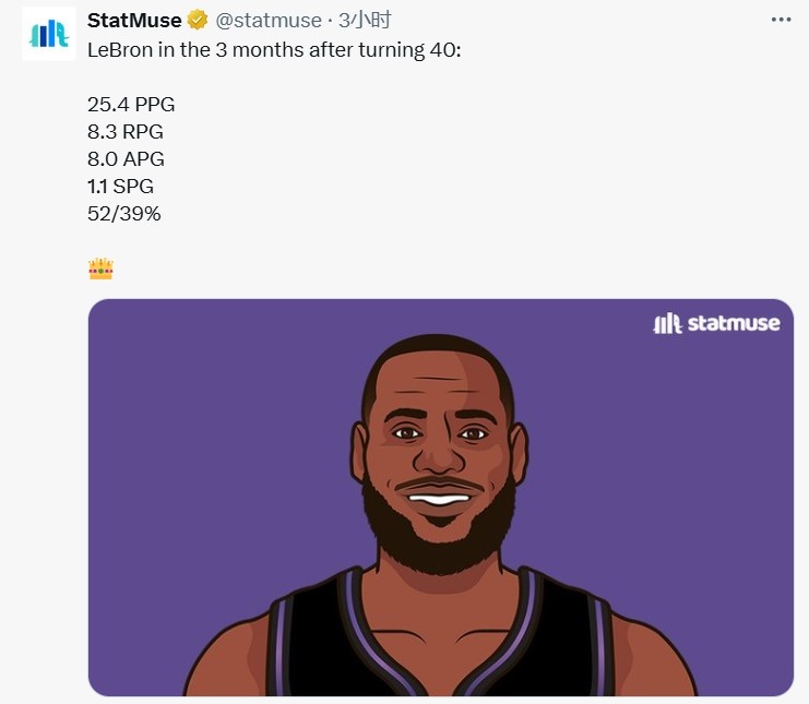 8月9日訊 今日數據媒體StatMuse曬出詹姆斯年滿(mǎn)40歲之后3個(gè)月的場(chǎng)均數據,并配文:??。