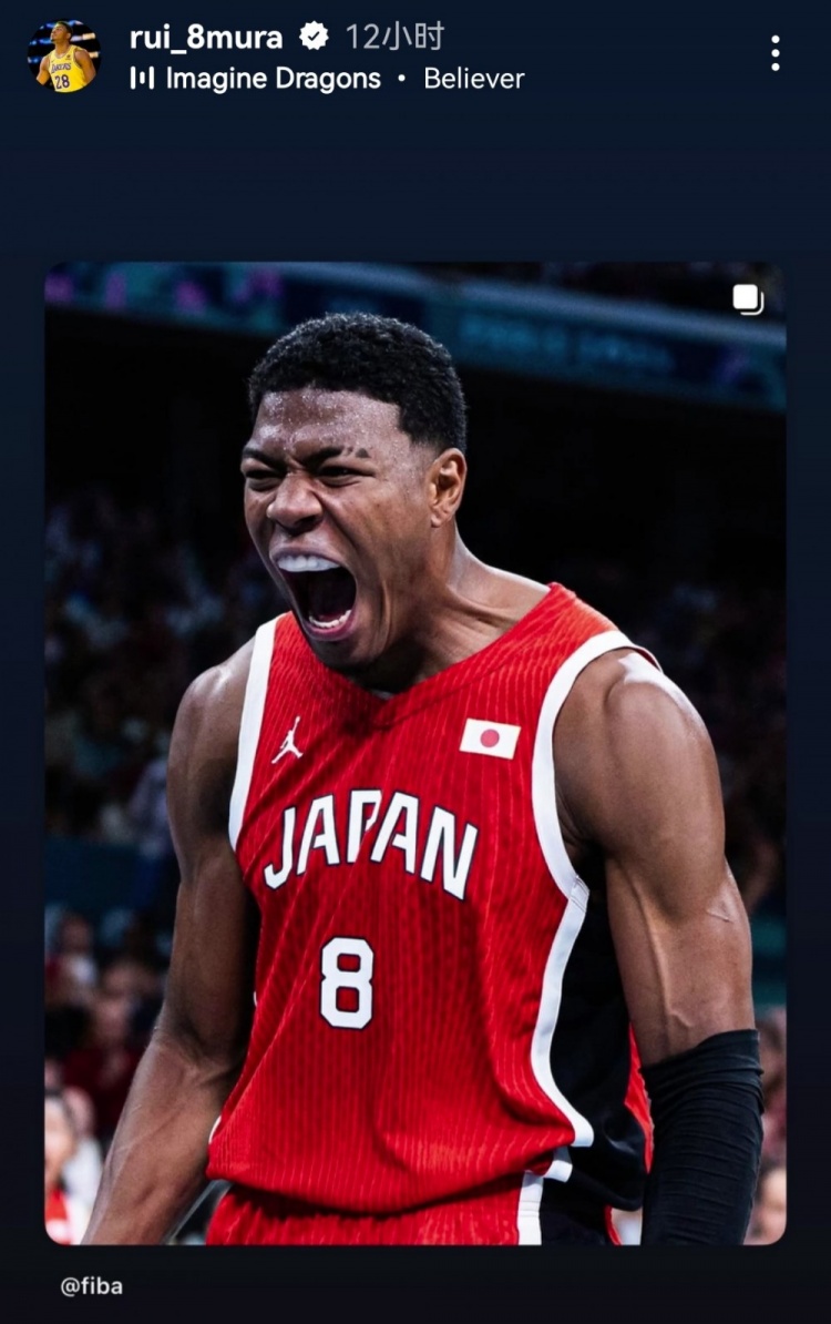 賽后,湖人球星八村塁更新社媒動(dòng)態(tài),轉發(fā)了一張自己的國家隊怒吼照,背景音樂(lè )為夢(mèng)龍樂(lè )隊的經(jīng)典單曲《Believer》(信徒)。