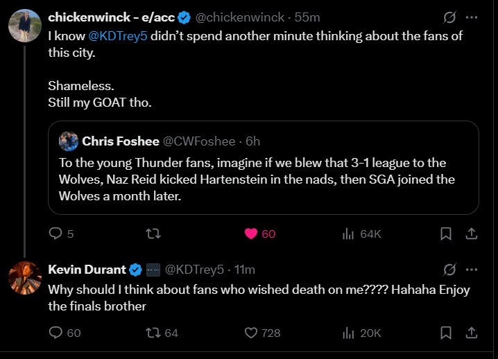 網(wǎng)友Chris Foshee:對于年輕的雷霆球迷來(lái)說(shuō),想象一下,如果我們3-1領(lǐng)先然后被森林狼逆轉了,里德還踢了哈爾滕施泰因的要害,然后SGA一個(gè)月后加盟了森林狼……(暗示16年勇士曾逆轉雷霆、之后KD加盟勇士)。