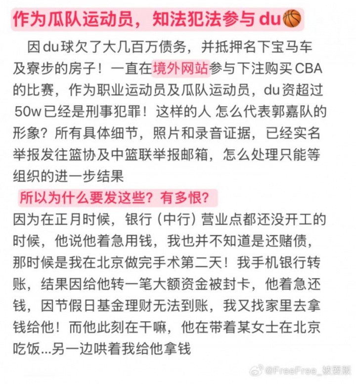 女網(wǎng)友表示徐杰欠下大幾百萬(wàn)賭債,還抵押了名下寶馬車(chē)以及寮步的房子。徐杰一直在境外網(wǎng)站參與下注CBA比賽,她表示自己已向籃協(xié)和中籃聯(lián)郵箱實(shí)名舉報。