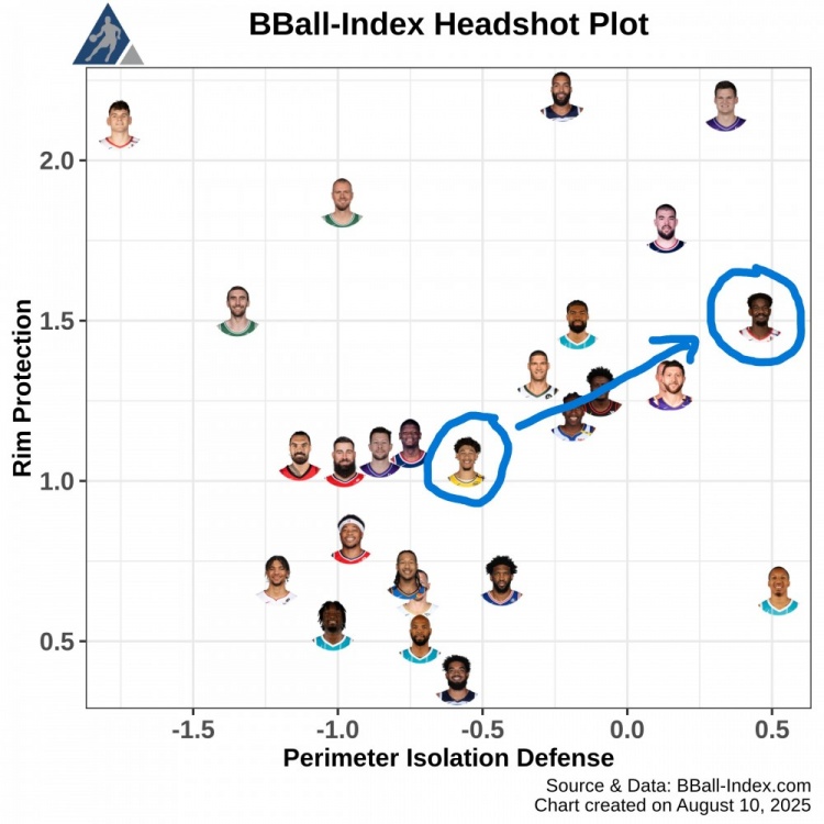 Cranjis McBasketball給出了一張2024-25賽季站樁型內線(xiàn)的護筐與外線(xiàn)單防能力象限圖,其中縱坐標數值越大表示護筐能力越強,橫坐標數值越大表示外線(xiàn)單防能力越強。