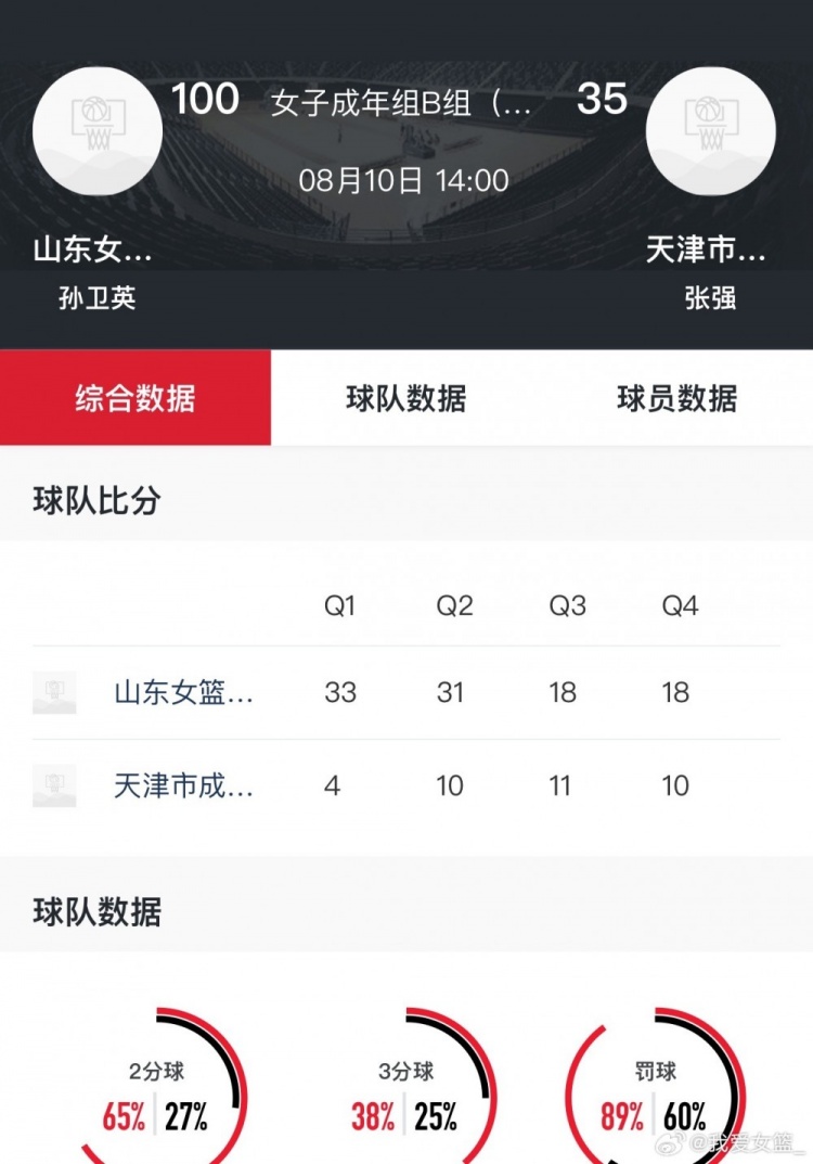 山東隊也不遑多讓?zhuān)?名首發(fā)球員上場(chǎng)時(shí)間都只有10分鐘左右,半場(chǎng)打出了64-14的離譜比分,球隊12人全部登場(chǎng),且人人都有得分,幾名大學(xué)生球員王家繪、邢欣等也得到了不少的上場(chǎng)時(shí)間。不得不說(shuō),全運會(huì )女籃成年組資格賽兩極分化嚴重,實(shí)力差距實(shí)在太大了!