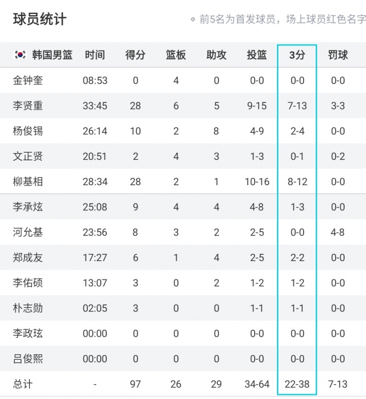 08月10日訊 亞洲杯A組小組賽,韓國僅用三節就命中17記三分球將比賽打花,最終韓國隊全場(chǎng)命中22記三分并以97-86擊敗黎巴嫩。