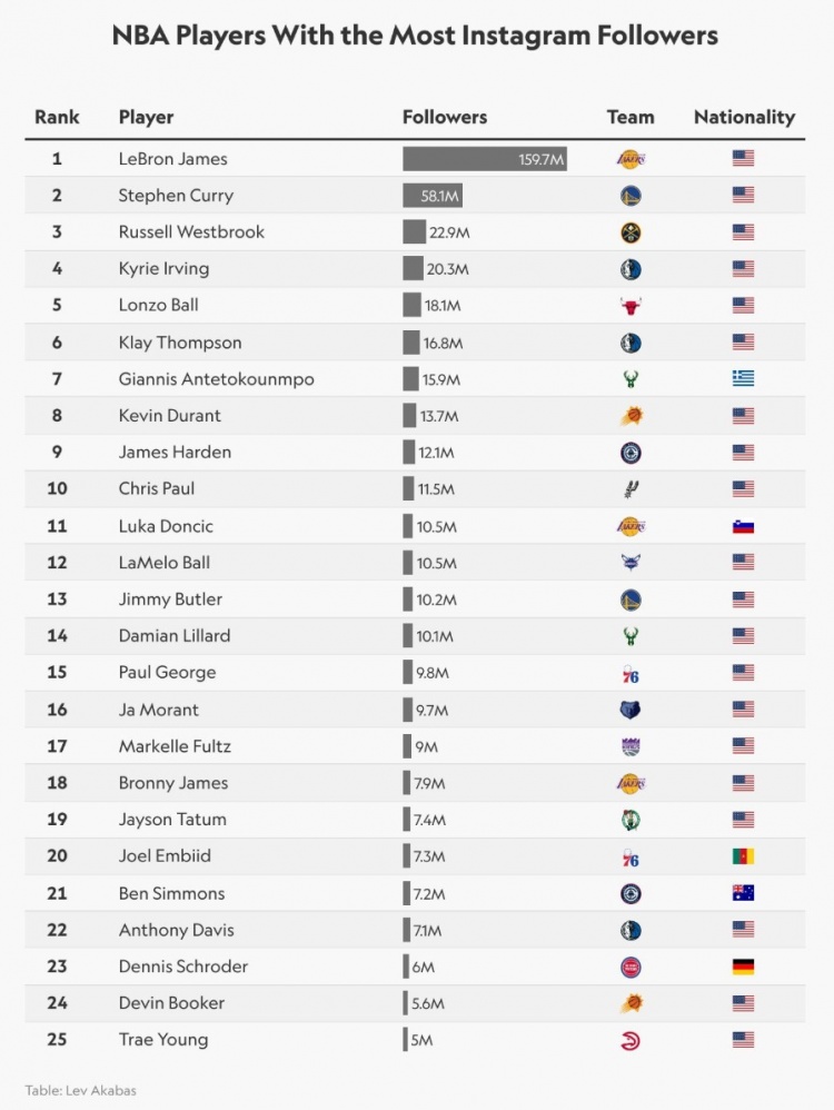 NBA球員INS粉絲數排行:詹姆斯1.597億斷檔領(lǐng)銜 庫里威少分列二三