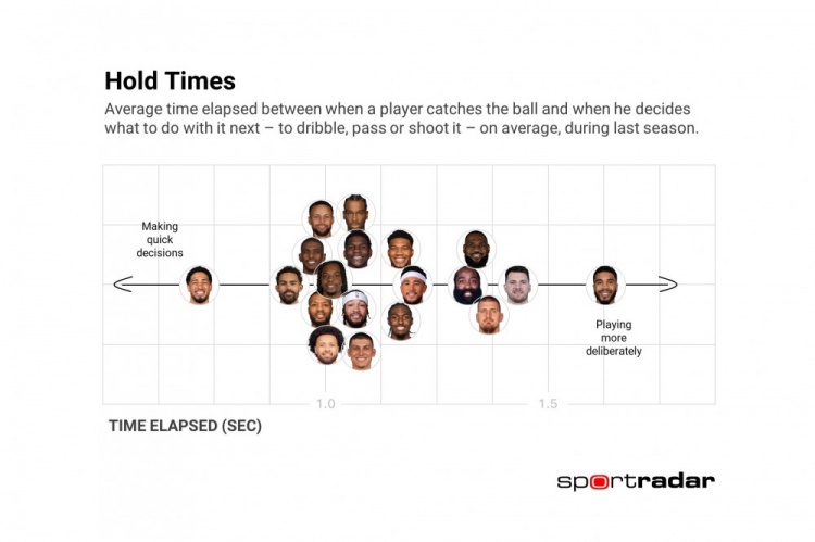 8月11日訊?數據專(zhuān)家Todd Whitehead統計了上賽季,進(jìn)攻發(fā)起者在接到球之后,做出下一步行動(dòng)(運球、傳球或投籃)所用的平均時(shí)間,具體如圖。