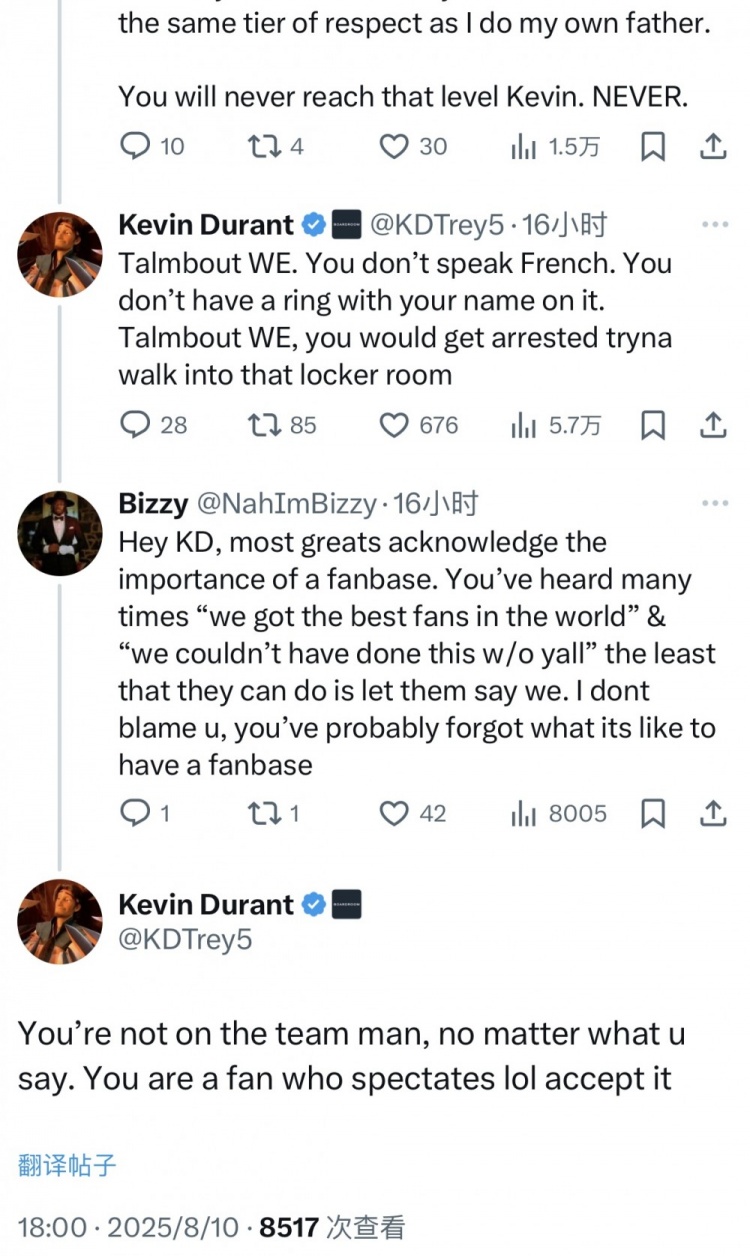 球迷B(昵稱(chēng)為“Bizzy”):“KD,大多數偉大的球員都承認球迷的重要性。你聽(tīng)過(guò)很多次‘我們擁有世界上最好的球迷’以及‘沒(méi)有你們我們做不到’。他們至少可以說(shuō)“我們”。我不怪你,你可能已經(jīng)忘了擁有球迷的感覺(jué)?!?/p>