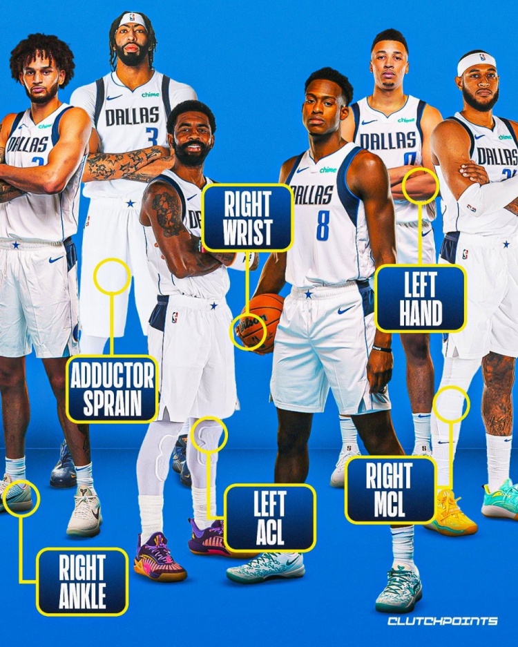 圖中的傷病具體為:萊夫利(右腳踝)、濃眉(腹股溝)、歐文(左膝蓋前十字韌帶)、普羅斯珀(右手腕)、??怂_姆(左臂)、華盛頓(右膝內側韌帶)。