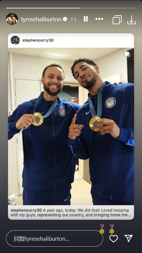 哈利伯頓轉發(fā)了庫里的Instagram中跟自己的合影,并附上了“????”。