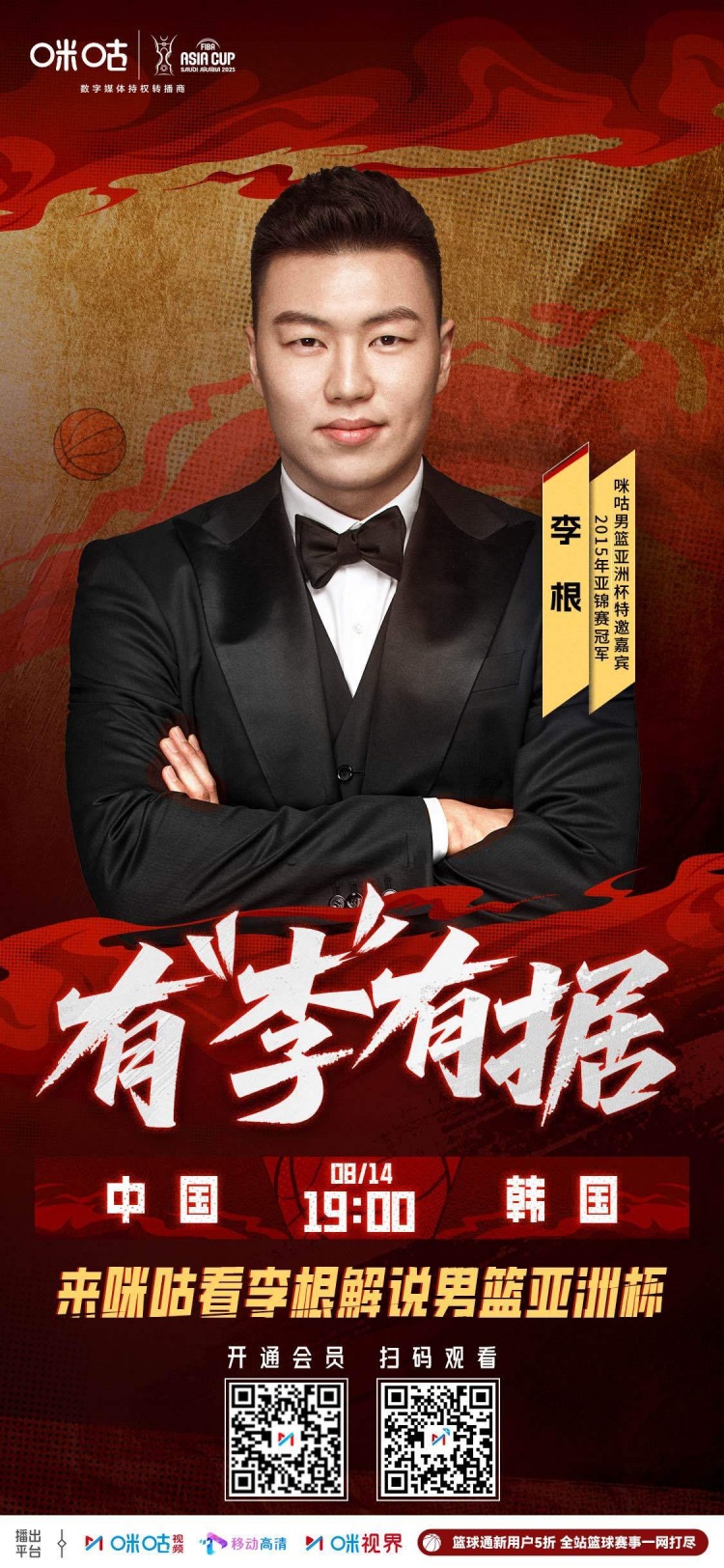 咪咕官方宣布,周琦和前國手李根將擔任本場(chǎng)比賽解說(shuō)嘉賓。