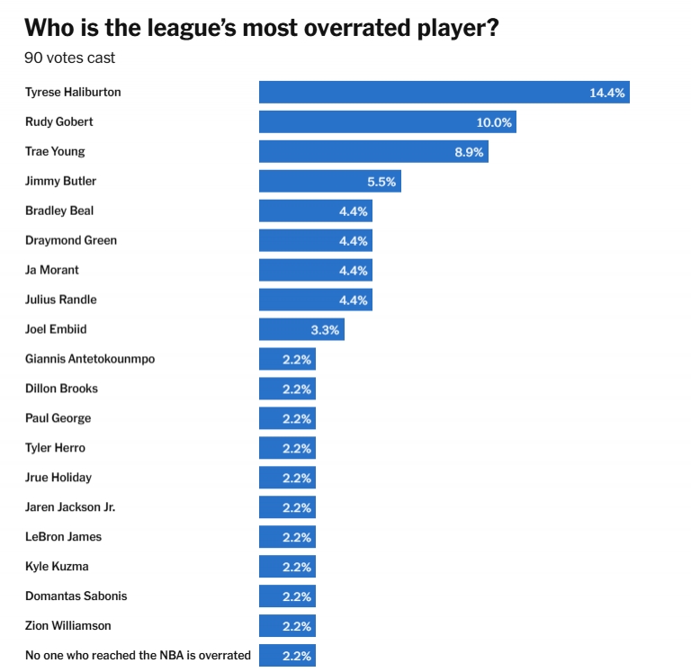 在誰(shuí)是聯(lián)盟中最被高估的球員的話(huà)題(90人投票)中,哈利伯頓得票最多,達到了14.4%,戈貝爾和特雷-楊分列二三位,恩比德、字母哥、喬治、詹姆斯和錫安等多位球星上榜。