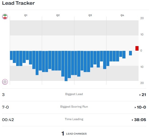 據統計,中國臺北全場(chǎng)領(lǐng)先了38分05秒,而伊朗最后時(shí)刻完成反超,全場(chǎng)領(lǐng)先優(yōu)勢只交換過(guò)1次,伊朗的領(lǐng)先時(shí)間僅有42秒。