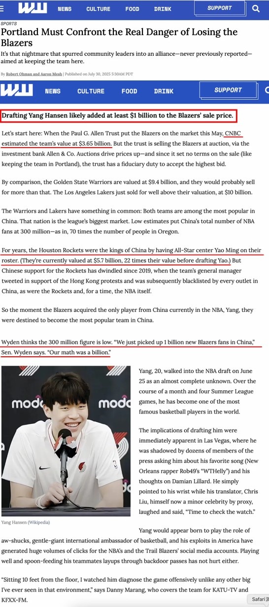 從CNBC評估到正式交易,過(guò)了大約三個(gè)月,這其中有NBA球隊價(jià)格繼續水漲船高的因素,但是《威拉米特周刊》的作者在文章專(zhuān)門(mén)用一個(gè)章節,重點(diǎn)介紹了楊瀚森給開(kāi)拓者可能帶來(lái)的增值效應。