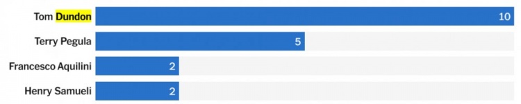 卡羅來(lái)納颶風(fēng)隊老板湯姆-鄧頓在這一類(lèi)別中遙遙領(lǐng)先——考慮到他所執掌的球隊在賽場(chǎng)上取得了相對不錯的成績(jì),這樣的結果可能會(huì )讓不少人感到有些驚訝。