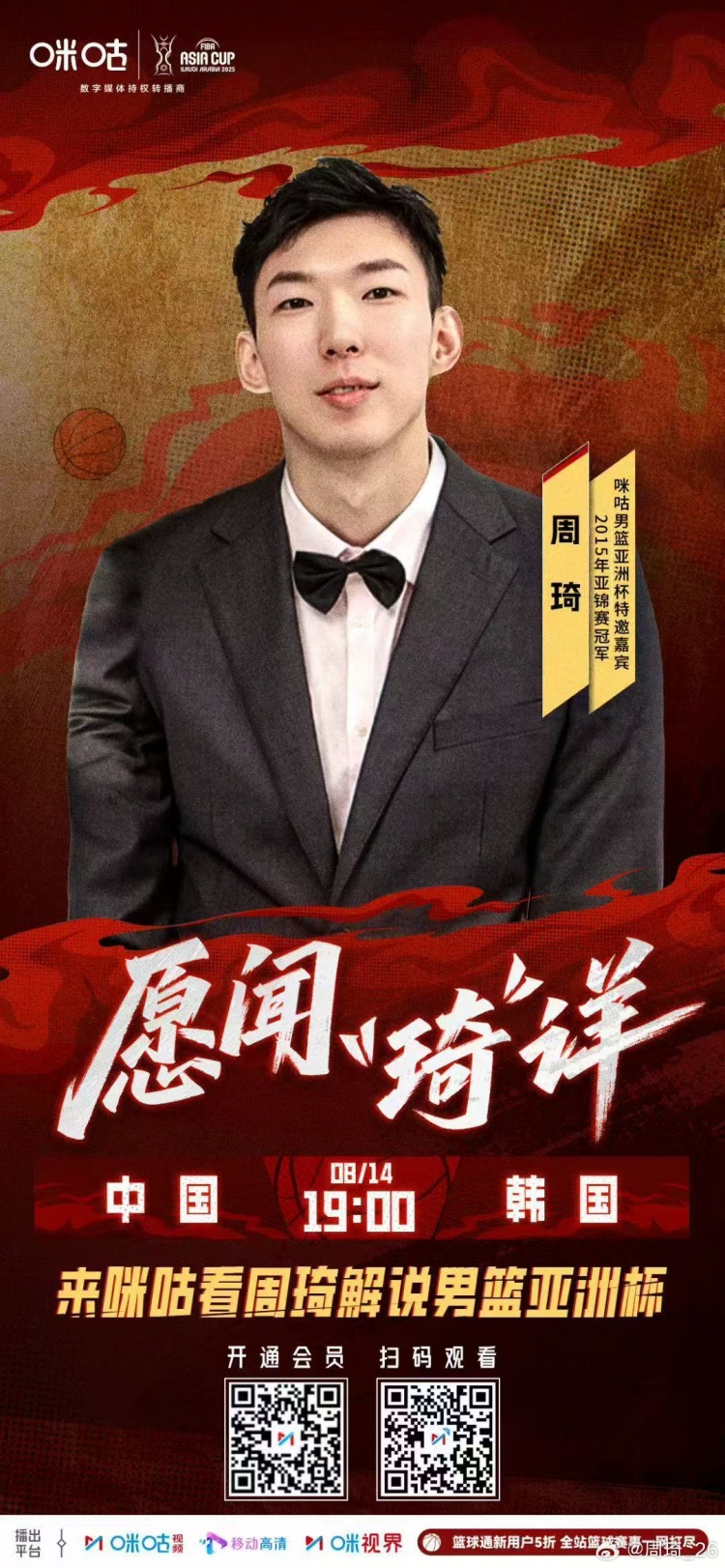 此前,咪咕官方宣布,周琦和前國手李根將擔任本場(chǎng)比賽解說(shuō)嘉賓。