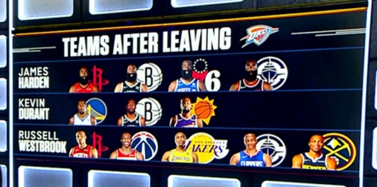 2012年,杜蘭特、威少和哈登率雷霆打進(jìn)總決賽,他們三人在離隊后換隊數量如下: