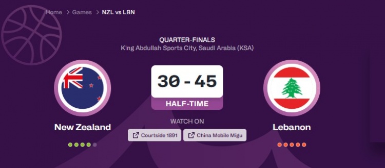 8月15日訊 男籃亞洲杯1/4決賽,新西蘭隊上半場(chǎng)30-45落后黎巴嫩隊。