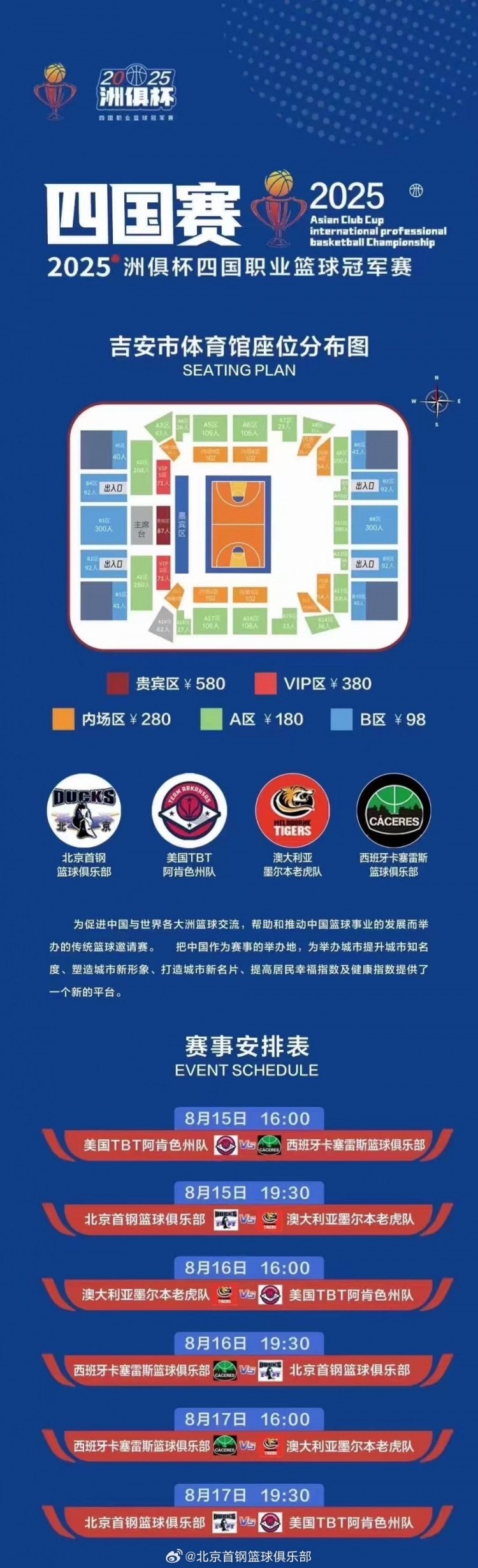 8月15日訊 北京男籃官博消息,北京隊將在江西吉安參加2025洲俱杯四國職業(yè)籃球冠軍賽。