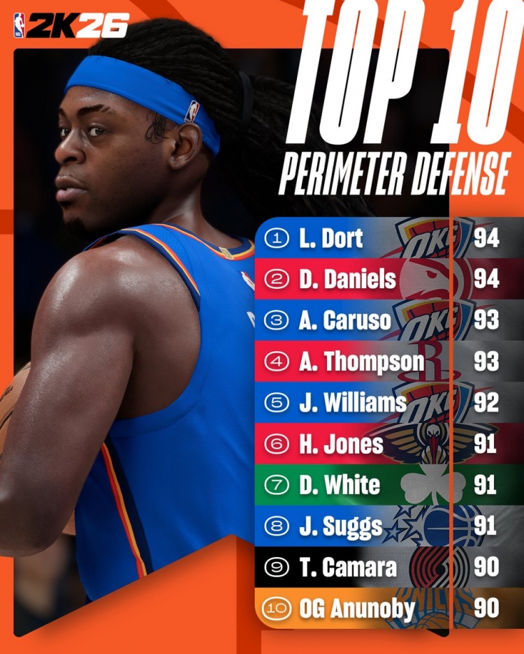08月16日訊 NBA2K官方曬出了NBA2K26外線(xiàn)防守能力值前十的球員,具體如下: