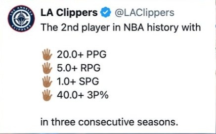 據官方統計,萊昂納德連續三個(gè)賽季場(chǎng)均至少20分5籃板1搶斷,且三分命中率40%+,NBA歷史第二人,第一是拉里-伯德。