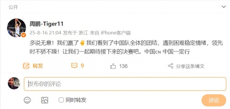 比賽結束后,老將周鵬在社媒上向中國男籃送上了祝賀,寫(xiě)道:“多說(shuō)無(wú)意!我們贏(yíng)了??我們看到了中國隊全體的團結,遇到困難穩定情緒,領(lǐng)先時(shí)不驕不躁!讓我們一起期待接下來(lái)的決賽吧。中國???? 中國一定行 ???”