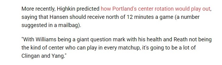 Highkin表示楊瀚森下賽季每場(chǎng)比賽可能獲得超過(guò)12分鐘的上場(chǎng)時(shí)間,他說(shuō):“由于羅威的健康狀況存在很大不確定性,而里斯又不是那種能勝任所有對位的中鋒,因此克林根和楊將承擔大部分任務(wù)?!?/p>
