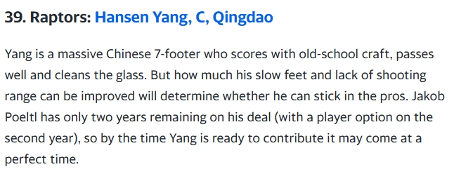 05月31日訊 雅虎體育記者Kevin O'Connor更新了大學(xué)生球員退選后的2025年NBA模擬選秀榜單,中國男籃新星、青島隊中鋒楊瀚森第39順位被猛龍選中。