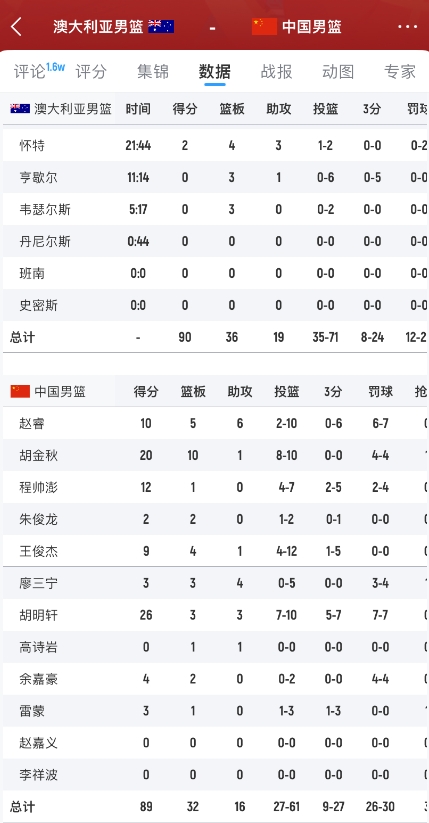 本場(chǎng)比賽,中國男籃全隊罰球30中26,命中率為86.7%。