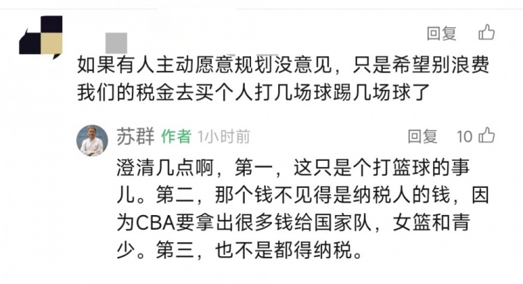 蘇群:“澄清幾點(diǎn)啊,第一,這只是個(gè)打籃球的事兒。第二,那個(gè)錢(qián)不見(jiàn)得是納稅人的錢(qián),因為CBA要拿出很多錢(qián)給國家隊,女籃和青少。第三,也不是都得納稅?!?/span>