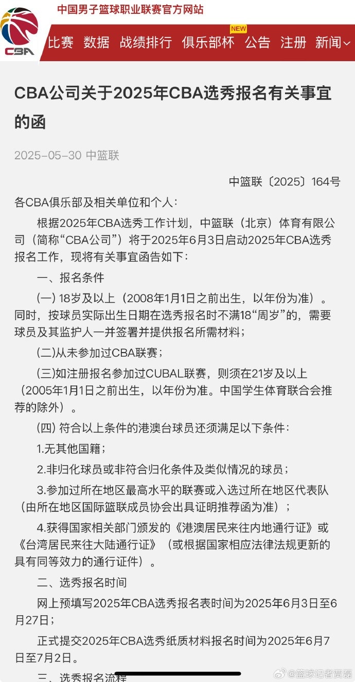 CBA官方公布選秀報名有關(guān)事宜,其中有兩項條款規定: